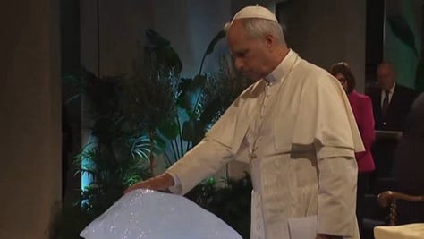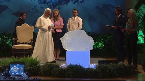We should hold out hope—yes, but it now seems pretty obvious where this is headed. It’s as clear, we could say, as ice, though of course, surprisingly, the felt banners have now become plastic tarps for the new liturgical service of planetary justice. (The Antartican Rite?)