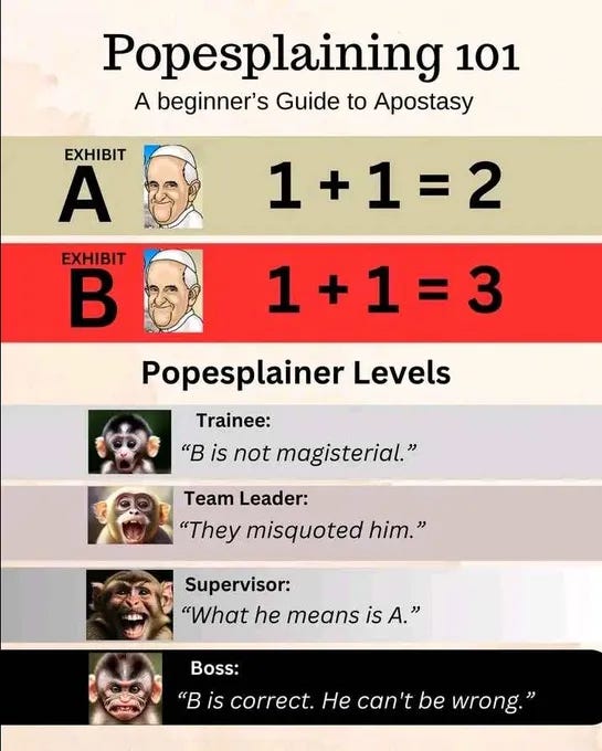 The popesplainers will now popesplain, but now that the mask appears to have dropped, and things have become clearer since the James Martin meeting, we can all unite again around the need to push back and push for solutions to the current mess. The real enemy is the bureaucratic anti-Church built up within the Church that is trying to choke out the faith with its WEF globalist ecumenical intercetional nonsense, and we can at least agree on fighting that. Let’s hope and pray that that’s what the recent wild news in the Vatican brings us closer to doing exactly that.