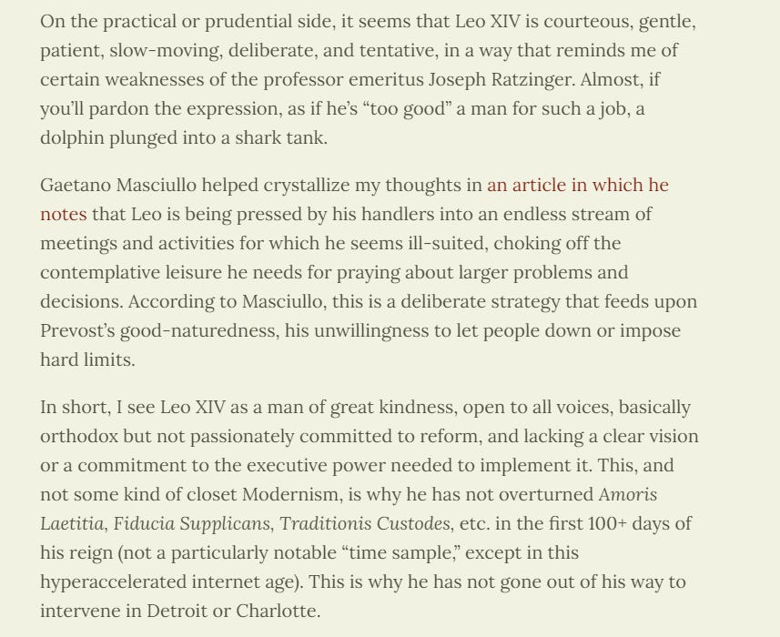 This is a really comfortable take. You want this one to be right. You want the Pope to be a simple, easy man to understand, with everything you don't like being easily explained away by reference to a blurry "bureaucracy" that was behind everything you don't like. But sometimes you're forced to consider that the Church is in a more complex environment. There are internal politics, yes, but there are also more complex external politics. (And there may be some truth here… still. Skip to the end!)