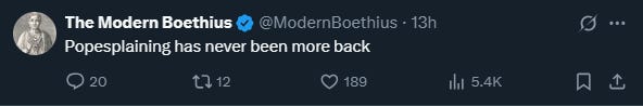 Popesplaining is now back, and with a vengeance (see Mike Lewis, Pope Respecter, and The Modern Boethius for examples), as is a more united traditionalist front, with the alliances temporarily wrecked in the uncertainties of the last few months seeming to be mending