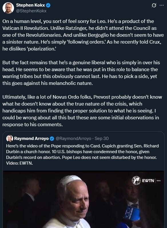 This stage is a popular one for traditional Catholics to take. Pope Francis Leo XIV is a good, well-intentioned man shaped by very poor circumstances. He was taught wrong but has good intentions...