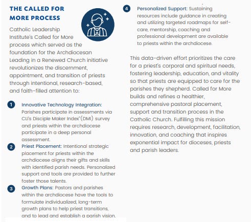 The Catholic Leadership Institute mentioned above is also in the business of “research-based” and “data-driven” master plan building for parishes and dioceses, advertising themselves as the masterminds behind diocesan renewal programs that entail, well, gathering data, developing metrics and targets, and then closing parishes, no mention made of the 30% or more who leave the faith entirely when their parishes close.