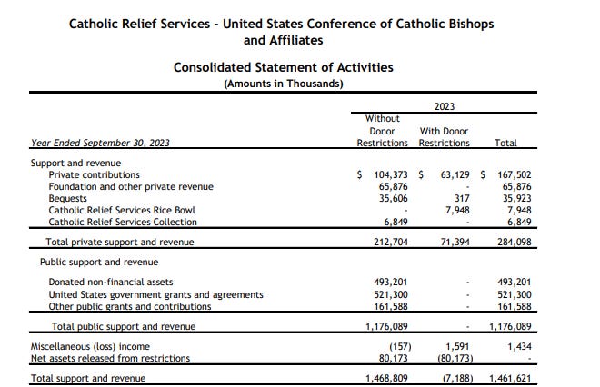 The financial dependence of dioceses, the United States Conference of Catholic Bishops, Catholic Relief Services (and during COVID, with billions of dollars dispersed to parishes in Paycheck Protection Program funding) on government funding ties the Church to the system, as with Catholic Relief Services’ being 80% dependent on the government to the tune of $1.1 billion a year, and the USCCB itself getting 60% of its revenue or $180 million a year from the government.