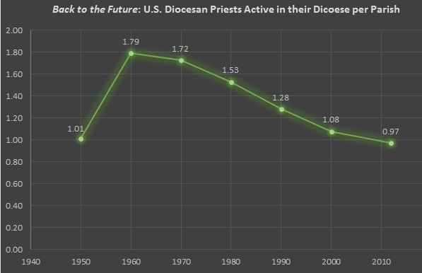 (Nota Bene: Not only do parishes have fewer priests, but they are also larger on average than they were in 1950, making the situation worse than merely returning to a 1950 status quo.)
