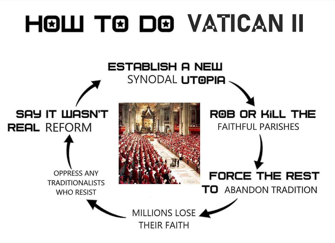 It’s a vicious cycle where decline begets decline, and crisis begets crisis, papering over the cracks by replacing the life of the Church starting to show in the post-conciliar “New Springtime”, while making it far harder for those who do want to practice their faith to do so.