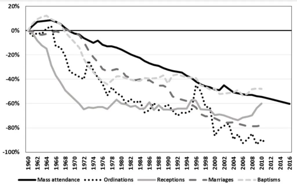 Vatican II and the spirit thereof just crushed the numbers of priests and religious and led to a permanent decline in vocations, with no recovery in sight.