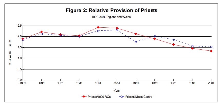 While lots of attention is put on the strain on priests and on religious orders from the massive declines they’ve endured over the last 60 years, and also on the closures of parishes due to these declines, having fewer priests per parish also has massive effects on the provision of the Sacraments, the ability of Catholics to seek spiritual direction from their priest, or their ability to have any meaningful relationship or pastorship over their flock.